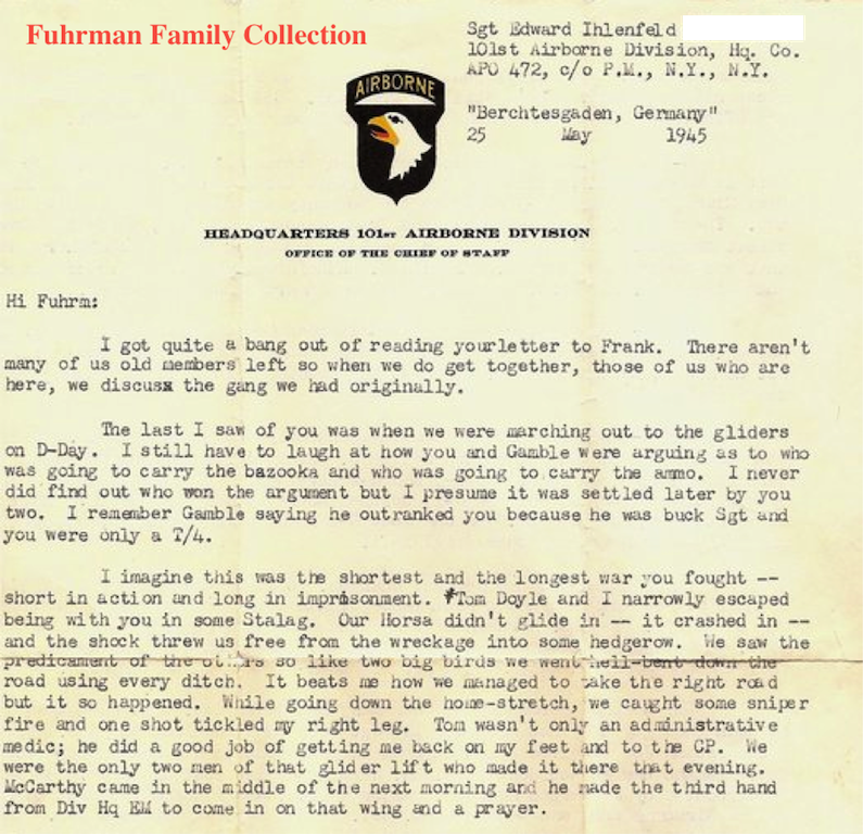Sgt. Edward Ihlenfeld (1920-2016) was my father-in-law. I've been researching his 101st Airborne service. I just finished reading a few dozen of his WWII letters. I'd love see a copy of the Harold Furman letter. Willing to share copies of Ihlenfeld's letters. He and your father may have known each other. wcbreihan@aol.com